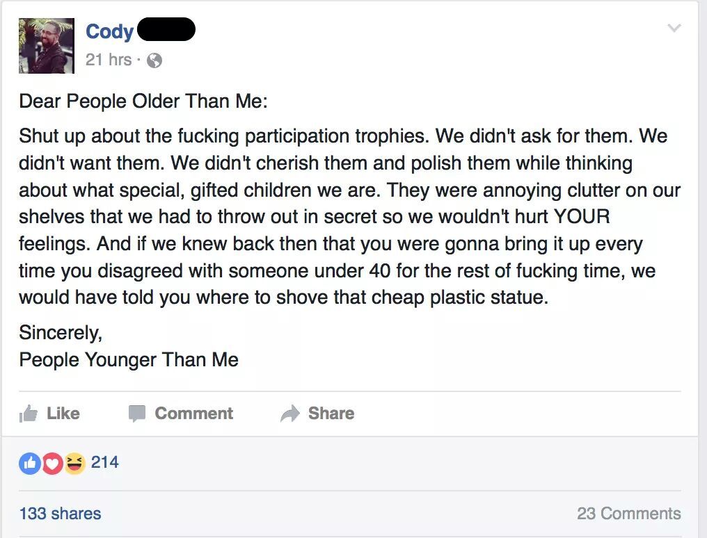 So, yeah, tell me again about how my generation expects trophies for participating. I dare you.