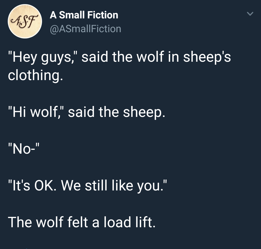 queersintherain Uncategorized October 12, 2018December 5, 2018 1 Minute awesomacious: The sheep and the wolf Share this: Share on X (Opens in new window) X Share on Facebook (Opens in new window) Facebook Like Loading... Related Published by queersintherain View all posts by queersintherain Published October 12, 2018December 5, 2018