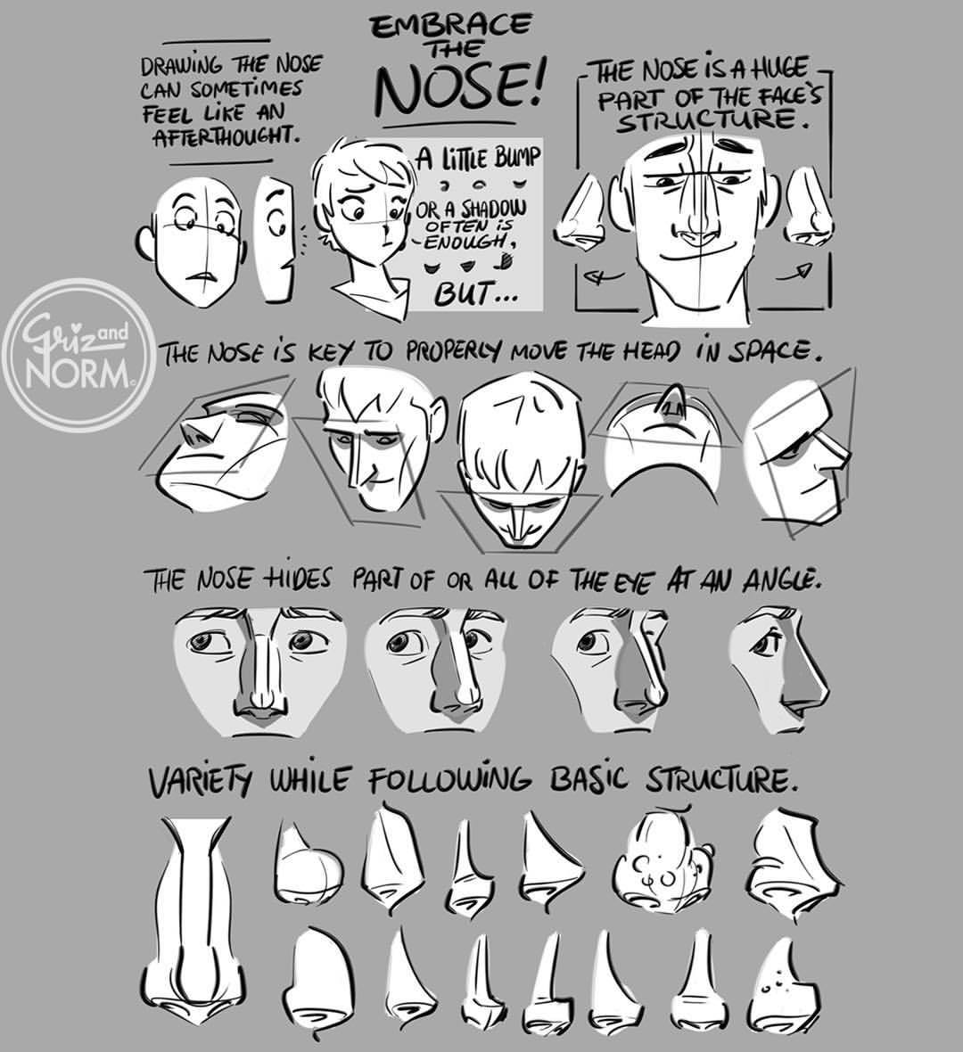 Tuesday Tips – Embrace The Nose / It’s very easy to take shortcuts when drawing the nose, and honestly, it’s fine most of the time. The nose is right in the center of the face and can unintentionally draw a lot of attention if constructed poorly. But when it’s embraced, it can do wonders. It’s key to track the facial features at odd angles and can bring a ton a personality to a character design. Use it or lose it! -Norm @grizandnorm #100tuesdaytipsbook #100tuesdaytips #tuesdaytips #arttips #arttutorial #embracethenose